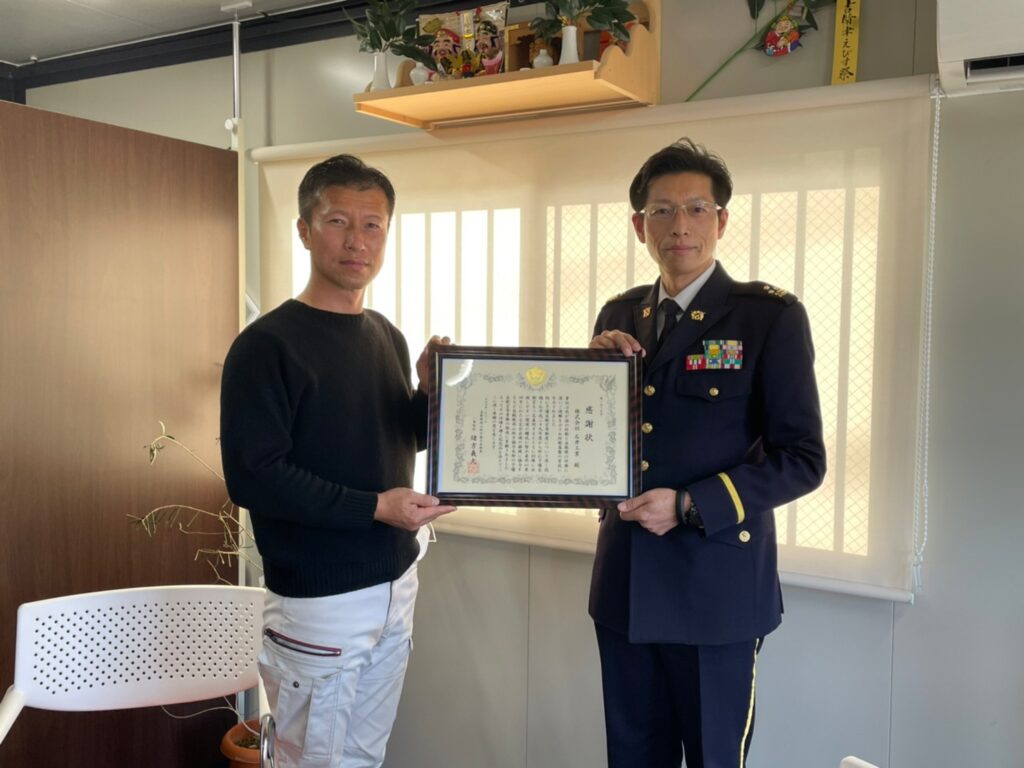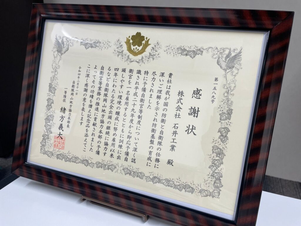 本日、弊社に自衛隊岡山地方協力本部の方々が事務所に来てくださり、「即応予備自衛官」の雇用しているということで、感謝状授与式が行われました。